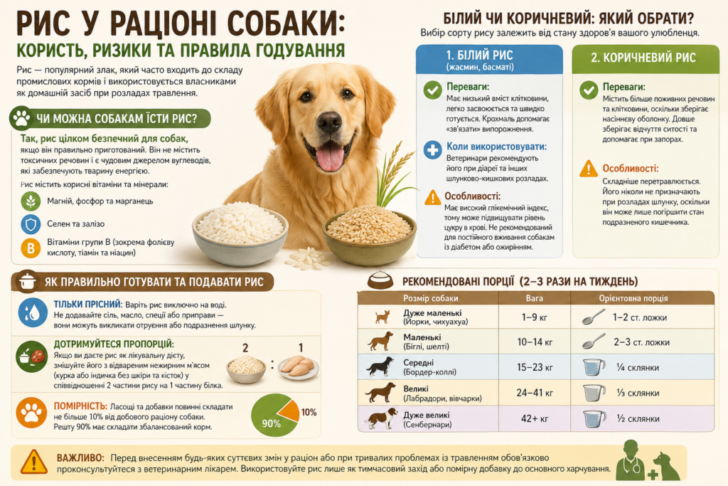 Важливо: Перед внесенням будь-яких суттєвих змін у раціон або при тривалих проблемах із травленням обов’язково проконсультуйтеся з ветеринарним лікарем. Використовуйте рис лише як тимчасовий захід або помірну добавку до основного харчування.